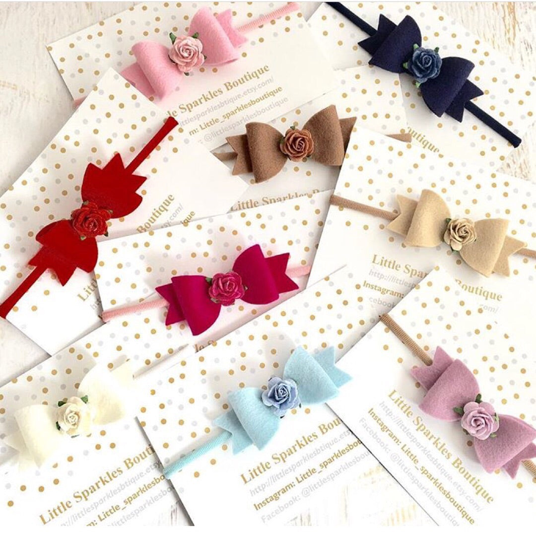 Rose bow is approx 3” in size made from 100% wool felt and a mulberry paper flower to match. Pick from the drop down colour required